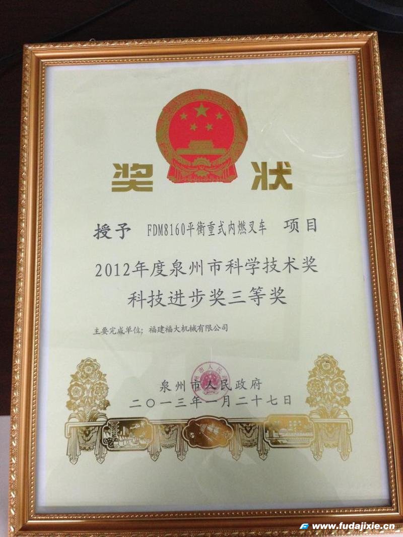 獲獎(jiǎng)背后,是政府部門對(duì)我司科技創(chuàng)新引導(dǎo)和鼓勵(lì)的體現(xiàn),更是我司科技綜合水平不斷進(jìn)步和個(gè)人研發(fā)實(shí)力的展示。自創(chuàng)立以來(lái),公司始終堅(jiān)持“戰(zhàn)略,發(fā)展,創(chuàng)新,蛻變”的企業(yè)經(jīng)營(yíng)理念,大力推進(jìn)企業(yè)自主創(chuàng)新,不斷提升企業(yè)知識(shí)產(chǎn)權(quán)創(chuàng)造和運(yùn)用水平,公司科技創(chuàng)新工作取得豐碩成果,佳音頻傳,不僅產(chǎn)品以減少污染、節(jié)能高效的性能獲得客戶的一致好評(píng),更為欣喜的是繼獲得“2011年度福建省優(yōu)秀新產(chǎn)品獎(jiǎng)二等獎(jiǎng)--FDM8300平衡重式內(nèi)燃叉車”榮譽(yù)之后,再獲泉州市人民政府授予的“2012年度泉州市科技進(jìn)步三等獎(jiǎng)”。科技獎(jiǎng)捷報(bào)傳來(lái),對(duì)我司促進(jìn)科技創(chuàng)新和發(fā)明創(chuàng)造,激發(fā)企業(yè)和個(gè)人科研動(dòng)力,促進(jìn)產(chǎn)業(yè)和社會(huì)發(fā)展,乃至進(jìn)一步在全社會(huì)營(yíng)造尊重科學(xué)、致力創(chuàng)新的氛圍,都是最有力的褒獎(jiǎng),也是最給力的推動(dòng)。